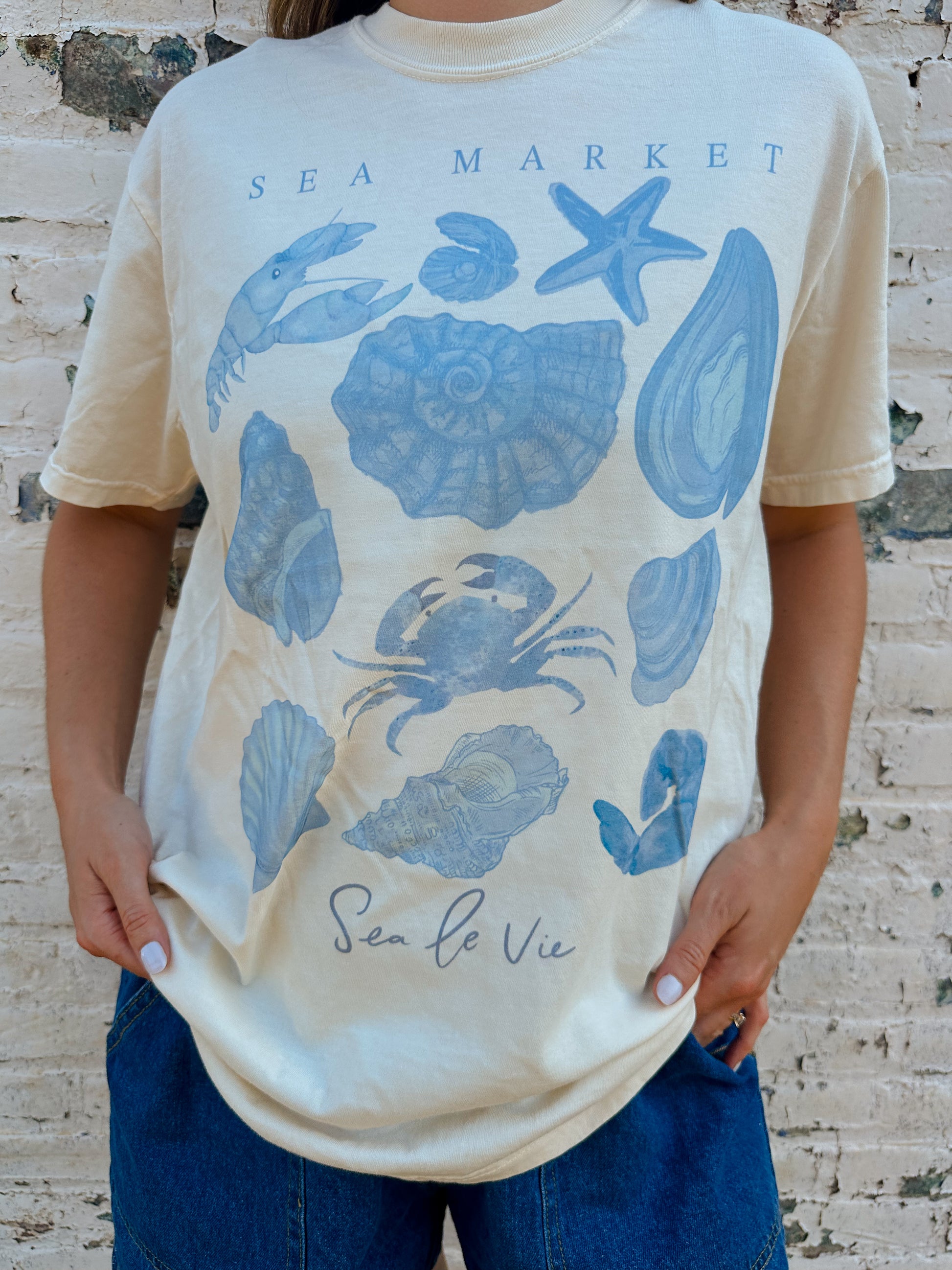 - A cream colored beachy graphic tee printed on a comfort colors shirt