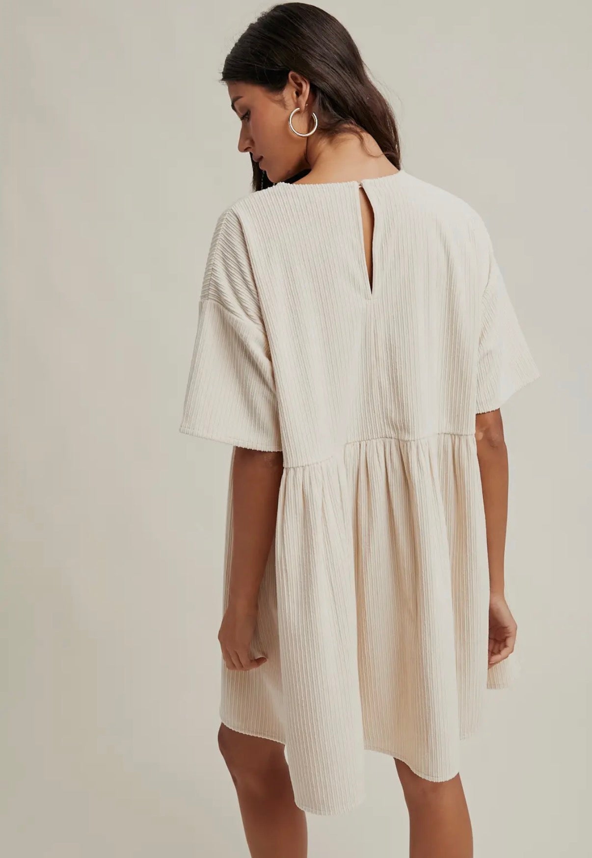 A loose and comfortable corduroy mini dress with side pockets, and a back keyhole with button closure.