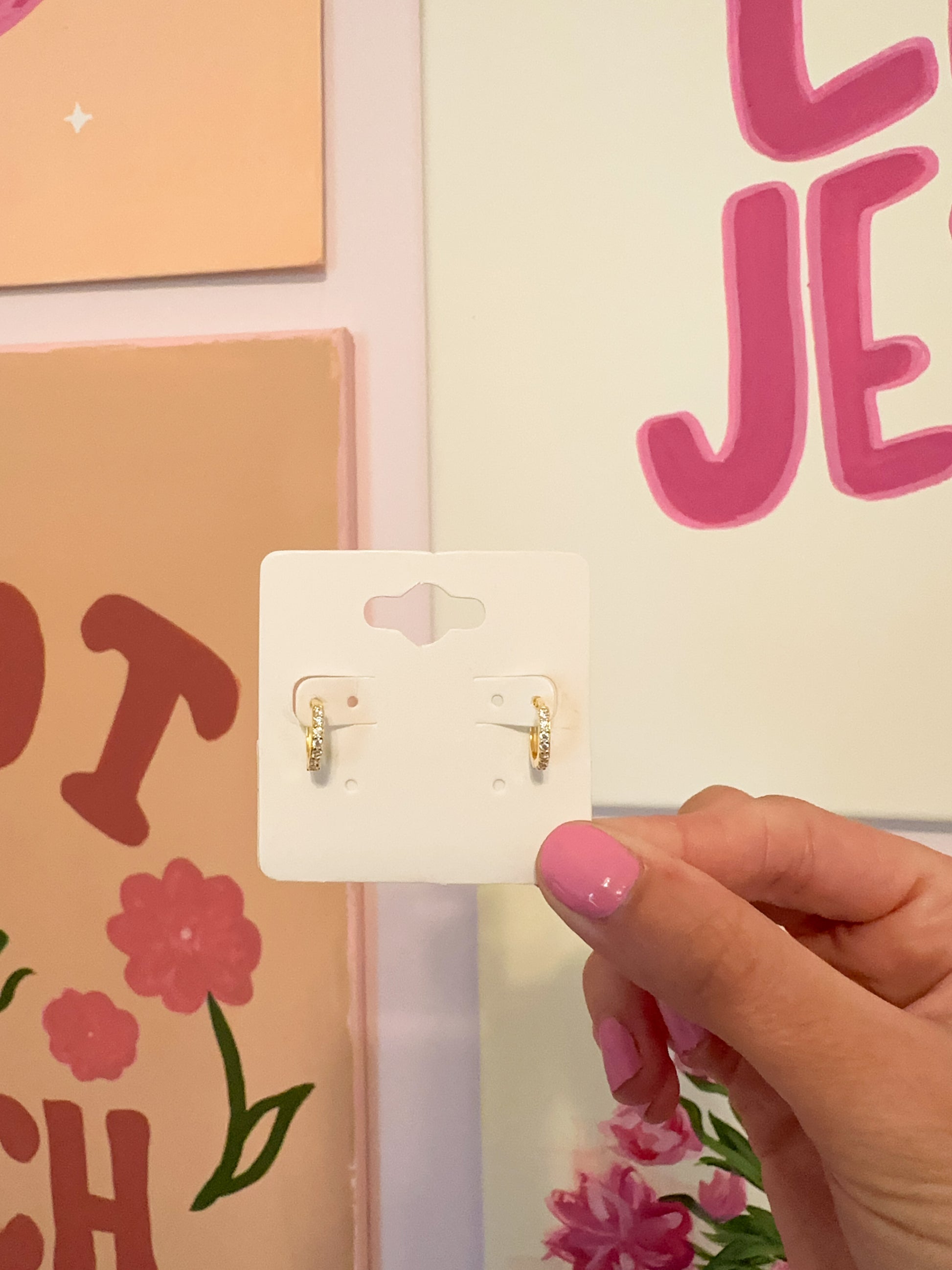 These are 12mm size earrings mare out of 925 sterling silver. They are gold plated with the cutest rhinestones on the front! They don’t turn your ears green and are perfect for everyday wear.